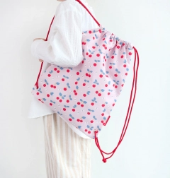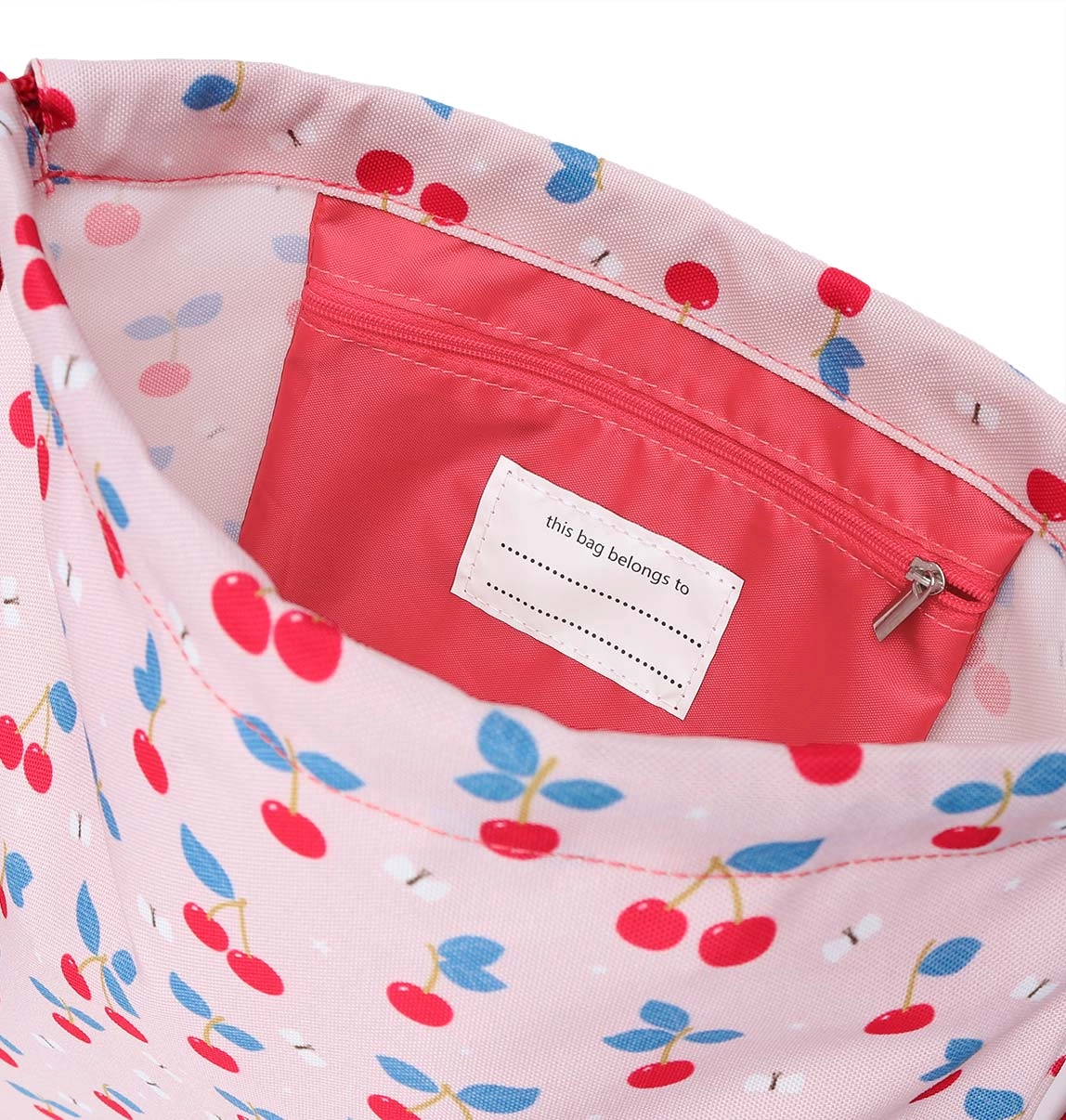 Stylový vak na záda s třešňovým vzorem bude spolehlivým parťákem do školy, na kroužky i na plavání. Je lehký, snadno se nosí a děti jej bez námahy stáhnou a zase otevřou. Uvnitř najdete praktickou zipovou kapsu na klíče, drobné nebo jiné cennosti.