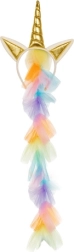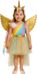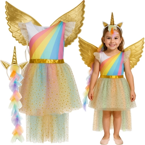 Kouzelný set pro malé milovnice fantazie obsahuje vše, co je potřeba k okamžité proměně – třpytivou sukénku s hvězdičkami, zlatá křídla na gumičkách a čelenku s ušima, hřívou a rohem. Díky jednoduchému oblékání přes hlavu a pružným prvkům je kostým rychle připraven k zábavě bez složitého zapínání.