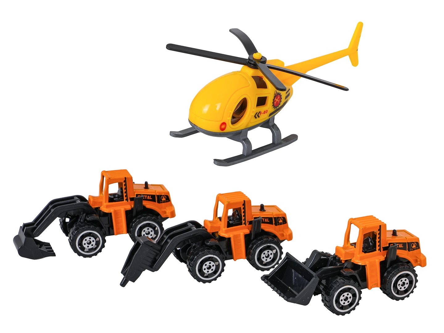 V balení najdete tři kovové stroje s pohyblivými částmi a žlutou helikoptéru pro zásahy ze vzduchu. Připraveno pro akční mise na stavbě.