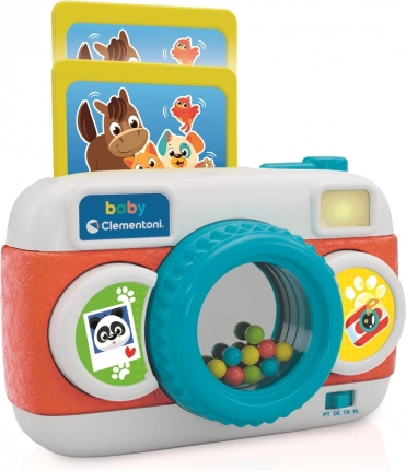 Tento mluvící fotoaparát od značky CLEMENTONI je navržen tak, aby malé dětské ruce snadno ovládaly všechna tlačítka. Barevná tlačítka spouštějí různé zvuky a melodie, blikající blesk přitahuje pozornost a malé zrcátko s kuličkami v objektivu povzbuzuje děti k objevování perspektivy a hloubky.