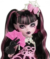 Draculaura zve na nejděsivěji sladkou párty století! Tahle ikonická monsterka přichází v nádherném goth outfitu s růžovými a černými detaily, doplněná o tematické příslušenství – od balónku ve tvaru srdce s netopýřími křídly po stylovou kabelku a hřebínek. Díky kloubové konstrukci lze panenku snadno pózovat a vystavit.