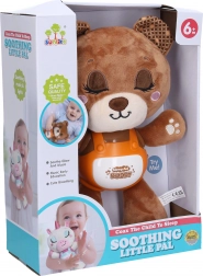 Roztomilý usínáček ve tvaru medvídka o velikosti 29 cm pomáhá dětem klidně usnout díky kombinaci ukolébavek, uklidňující hudby, zvuku chrápání a jemného nočního světla. Ovládání je snadné – stačí stisknout bříško a přepínat mezi režimy. Praktický přepínač on/off je umístěn na boku.