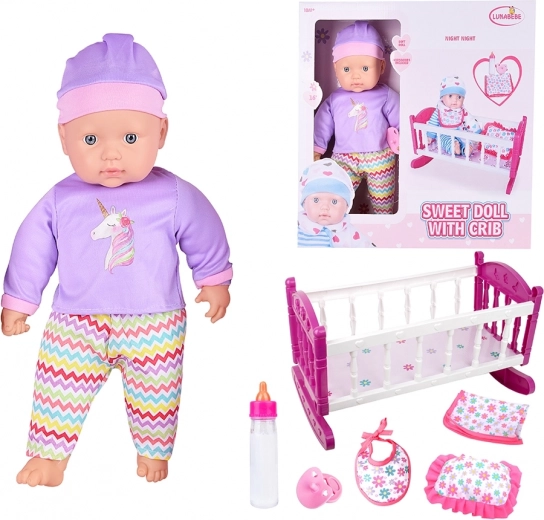 • Obsah balení: panenka v oblečku, dudlík, lahvička na mléko, kolébka, polštářek