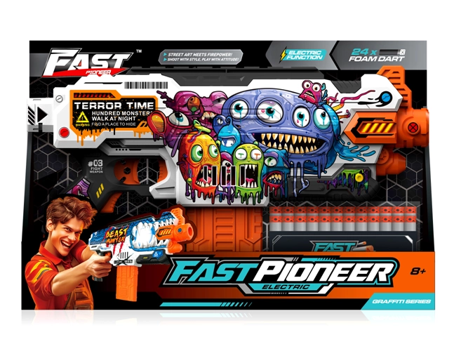 Zažijte akční zábavu s elektrickým blasterem Fast Pioneer, který zajišťuje rychlou a plynulou střelbu na stisk spouště. V balení najdete 24 měkkých pěnových nábojů pro bezpečné hraní doma i venku. Díky odolnému a bezpečnému designu a snadnému ovládání je ideální pro děti od 8 let.