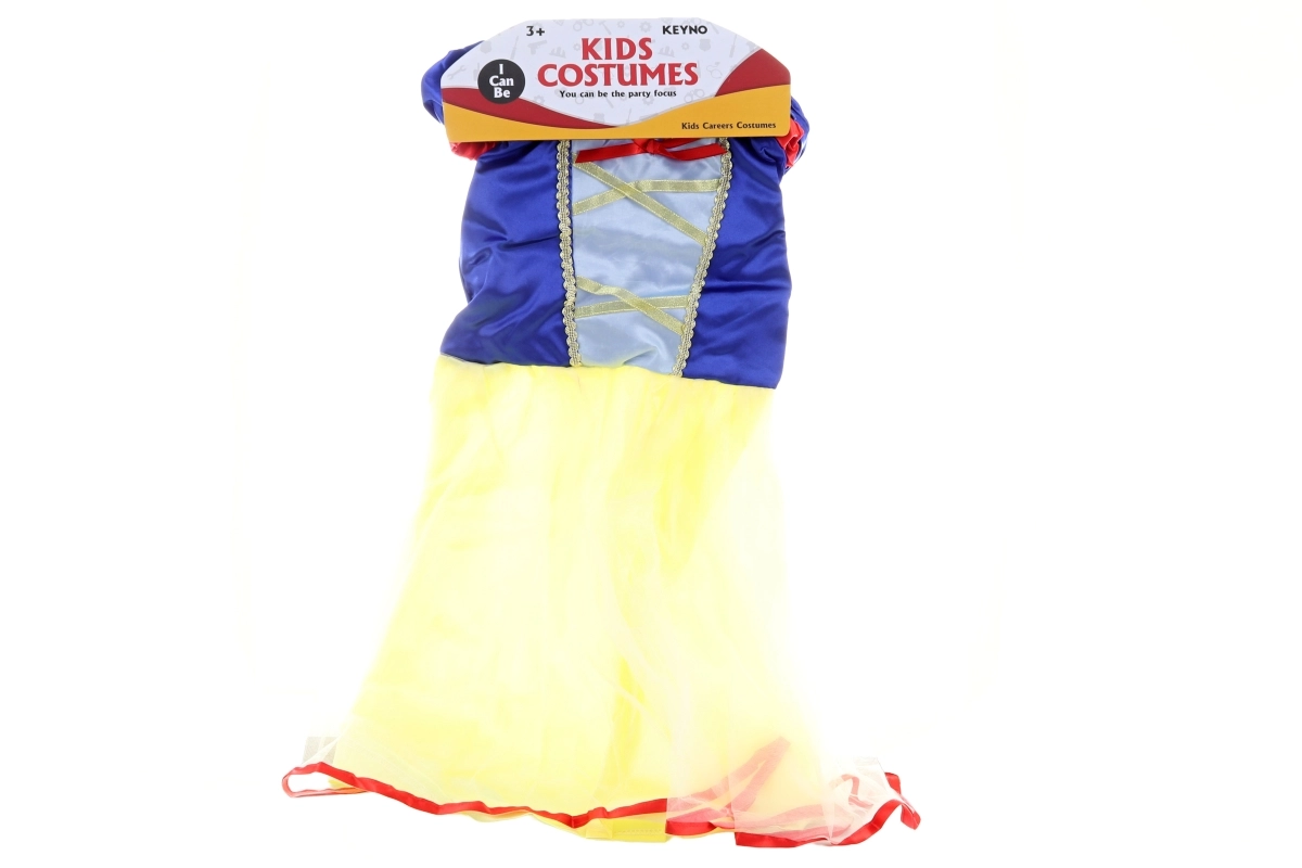 Proměňte svou holčičku v pohádkovou princeznu! Tyto šaty ve stylu Sněhurky zaujmou modrým živůtkem s ozdobným šněrováním a dlouhou žlutou sukní s červeným lemem. Skvěle se hodí na karneval, dětské oslavy i domácí hraní rolí.