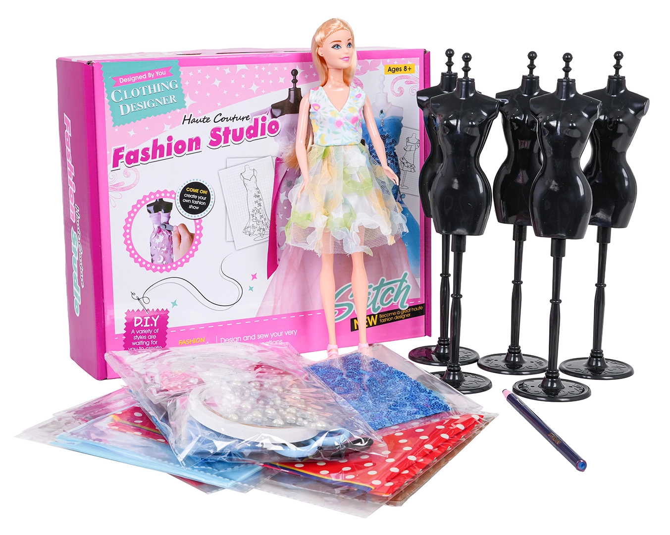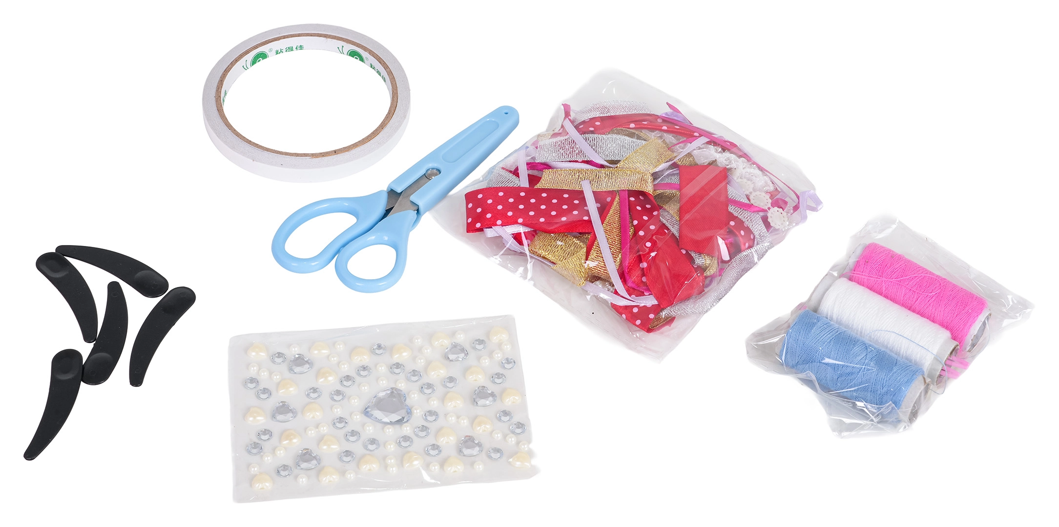 - 5× manekýn, panenka, nůžky, tužka/kredka, páska, 3× nit, aplikace na látku, barevné stuhy, 4× sáček s látkou a kartonovým střihem, sáček s flitrovou látkou, jehly (plastové i kovové)