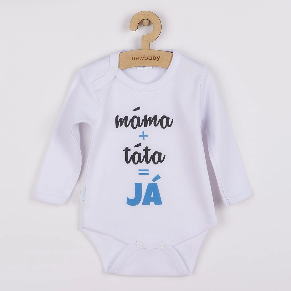 Promyšlené zapínání na cvočky na ramínku a mezi nožičkami výrazně usnadňuje oblékání a přebalování. Body je ideální jako originální dárek do výbavičky i na rodinné focení a díky nápisu máma + táta = JÁ vykouzlí úsměv každému.