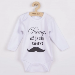 Originální bavlněné kojenecké body s dlouhým rukávem a vtipným nápisem Dámy, už jsem tady! potěší jako dárkové balení pro novorozence. Je vyrobeno z 100% bavlny, která je měkká a prodyšná pro citlivou dětskou pokožku. Certifikované barvy potisku jsou šetrné k miminkům. Praktické zapínání na cvočky na rameni a mezi nožičkami usnadňuje oblékání a přebalování.