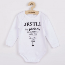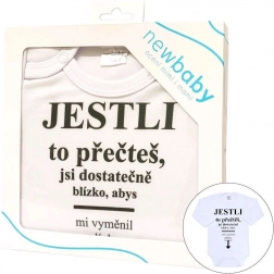 Roztomilé a pohodlné kojenecké body NEW BABY z kvalitní 100% bavlny s vtipným potiskem „Jestli to přečteš, jsi dostatečně blízko, abys mi vyměnil plínku“. Nabízí měkký a prodyšný materiál, certifikované barvy bezpečné pro miminka a praktické zapínání na cvočky na ramínku a mezi nožičkami pro snadné oblékání i přebalování.