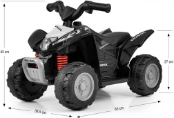 Robustní konstrukci podporují ocelové osy kol a plastová kola s terénním dezénem pro dobrou trakci. Komfortní tvarované sedadlo a stabilní čtyřbodový podvozek pomáhají malým jezdcům budovat rovnováhu, orientaci v pohybu a jemnou motoriku. Čtyřkolka je licencovaná značkou HONDA a splňuje CE bezpečnostní normy.