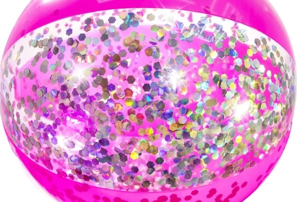Stylový nafukovací plážový míč se zlatým třpytem přinese spoustu zábavy u vody. Transparentní panely plné třpytek vytvářejí efektní lesk na slunci, míč je lehce nafukovací a díky bezpečnostnímu ventilu dobře drží vzduch. Ideální na bazén, pláž i zahradu.