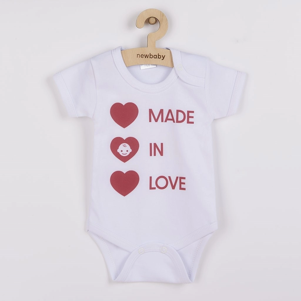 Roztomilé a pohodlné kojenecké body s krátkým rukávem od značky New Baby s nápisem MADE IN LOVE potěší každého rodiče. Je vyrobené z 100% bavlny s certifikovanými barvami vhodnými pro miminka. Praktické zapínání na cvočky na ramínku a mezi nožičkami usnadňuje oblékání i přebalování.