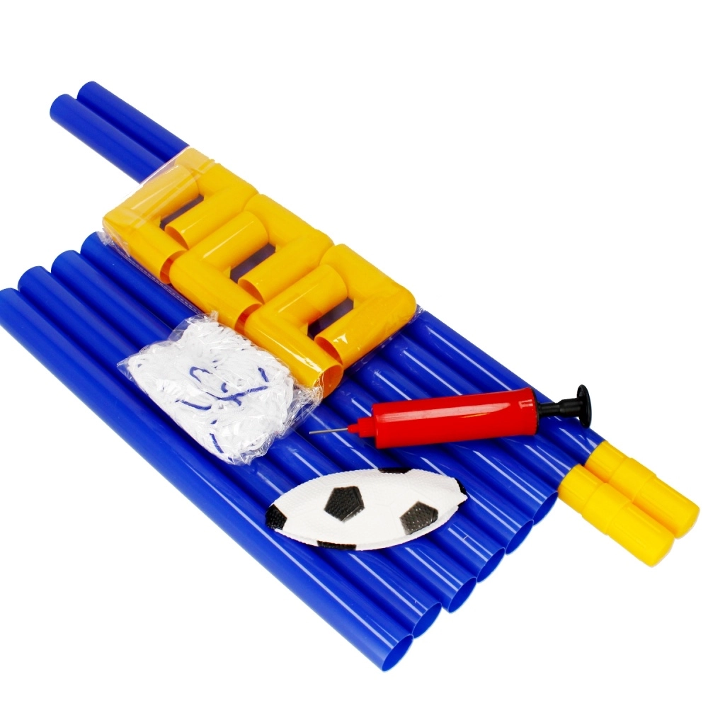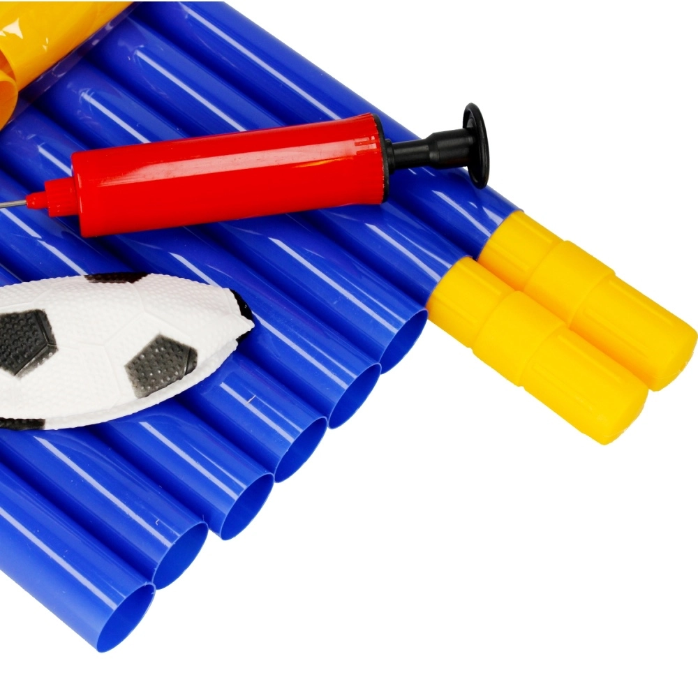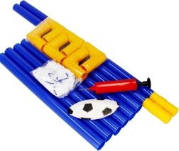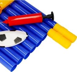 Set je dodáván jako kompletní balení: branka ze spojovacích trubek, síť, míček a ruční pumpička. Kolíky zajistí stabilitu branky na trávě, zatímco odolná síť spolehlivě zachytí každý gól. Skvělé pro rozvoj koordinace, pohybu a týmové hry.