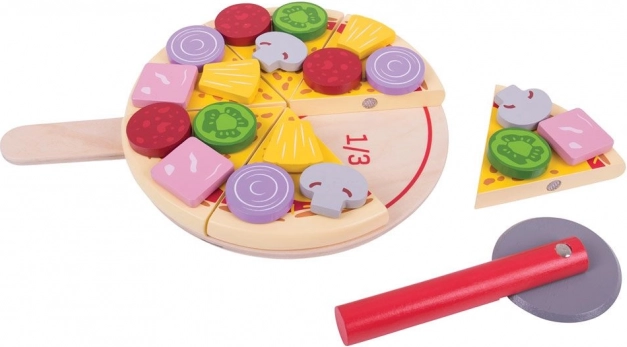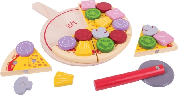Šest plátků pizzy se spojkami na suchý zip drží pohromadě a lze je „ukrojit“ dřevěným kráječem. Děti si vyzkouší realistické krájení a servírování.