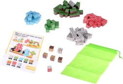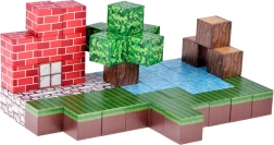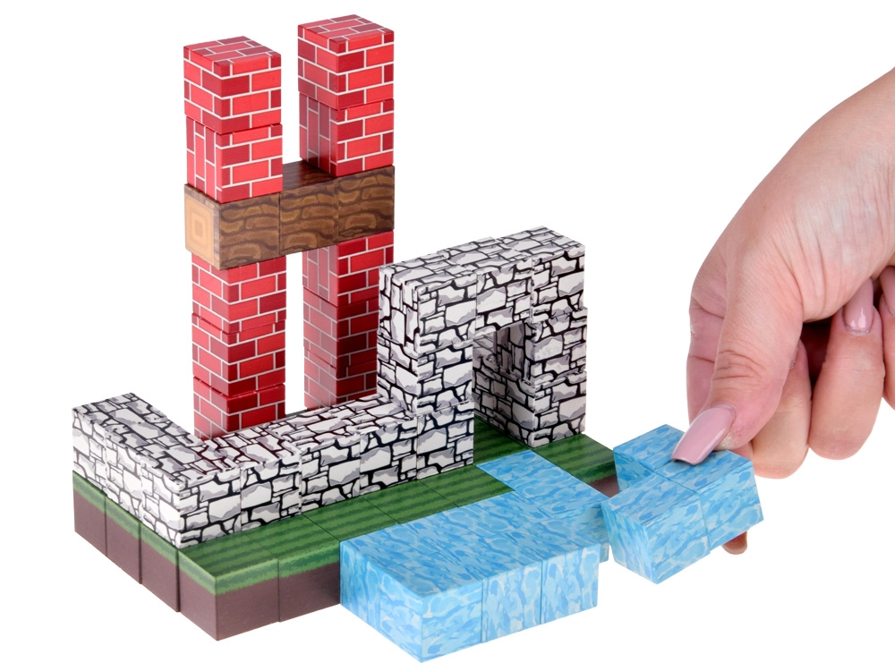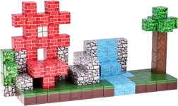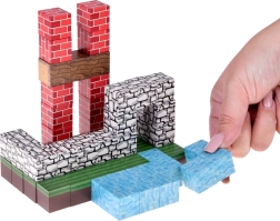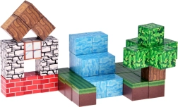 Rozmanitý mix kostek s potisky trávy, vody, cihel, kamene a dřeva vám umožní skládat domy, terén i stromy – přesně podle vašich představ.
