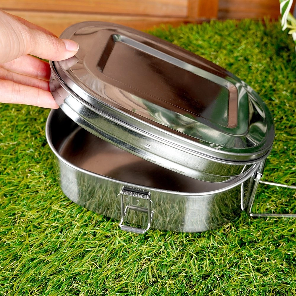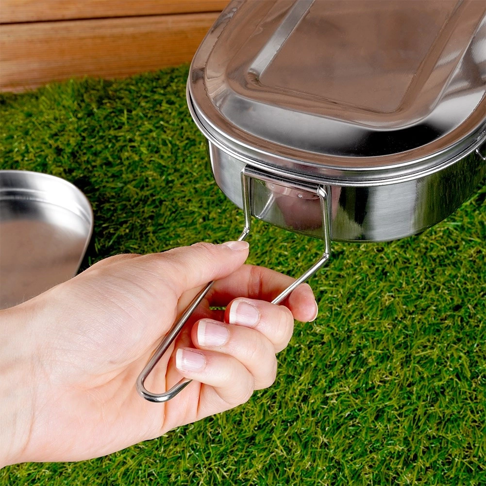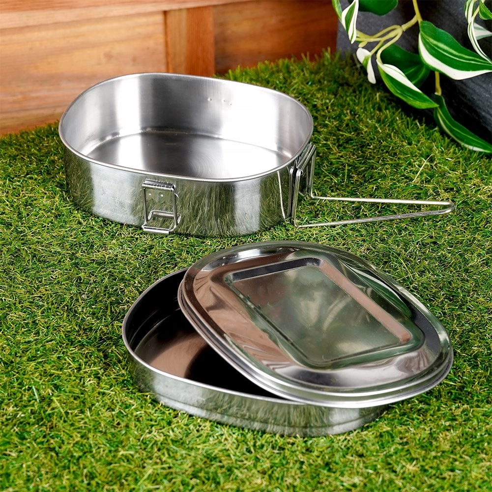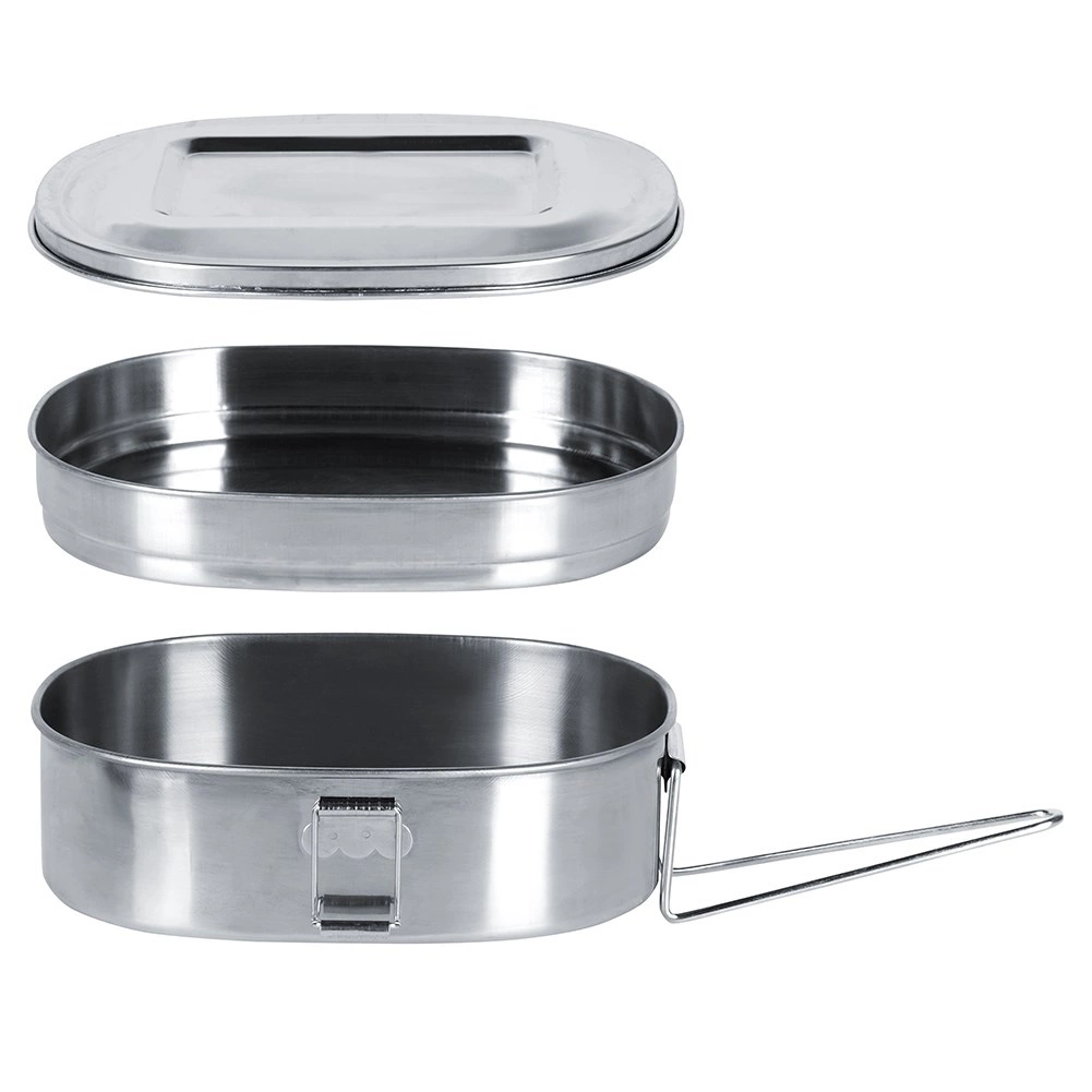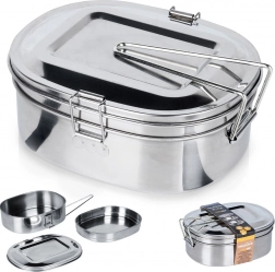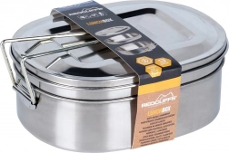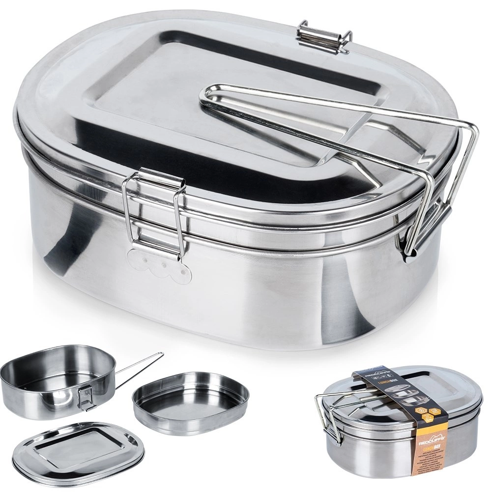 Praktická turistická menážka v podobě lunch boxu ze nerezové oceli nabízí dvě misky (350 ml a 900 ml) a víko pro bezpečné přenášení jídel. Je odolná, lehce omyvatelná a snadno se vejde do batohu. Ideální na výlety, kempování a pikniky. Výrobek značky REDCLIFFS.