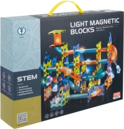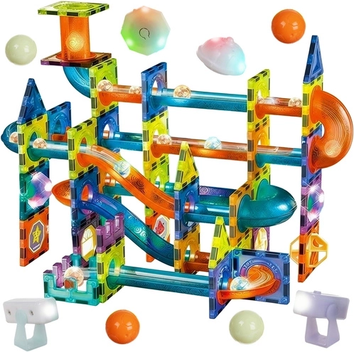Magnetické kostičky s kuličkovou dráhou umožní dětem stavět věže, mosty i spirálové sjezdy a sledovat, jak kuličky sviští průhlednými tunely. Pevné magnetické spojení zajistí stabilitu konstrukcí bez zbytečných pádů, zatímco LED prvky promění každou stavbu v světelnou show. Součástí je i barevný návod krok za krokem, který usnadní rychlý start a inspiruje k dalším nápadům.