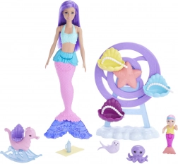 Objevte kouzelný podmořský svět s hracím setem Barbie mořská víla s miminkem. Hlavní panenka s levandulovými vlasy a růžovo‑modrým ocasem pečuje o roztomilé mořské miminko a mořské kamarády. Nechybí otočné kolotočové lehátko, houpací mořský koník, láhev a měkká dečka pro nekonečné příběhy plné fantazie.