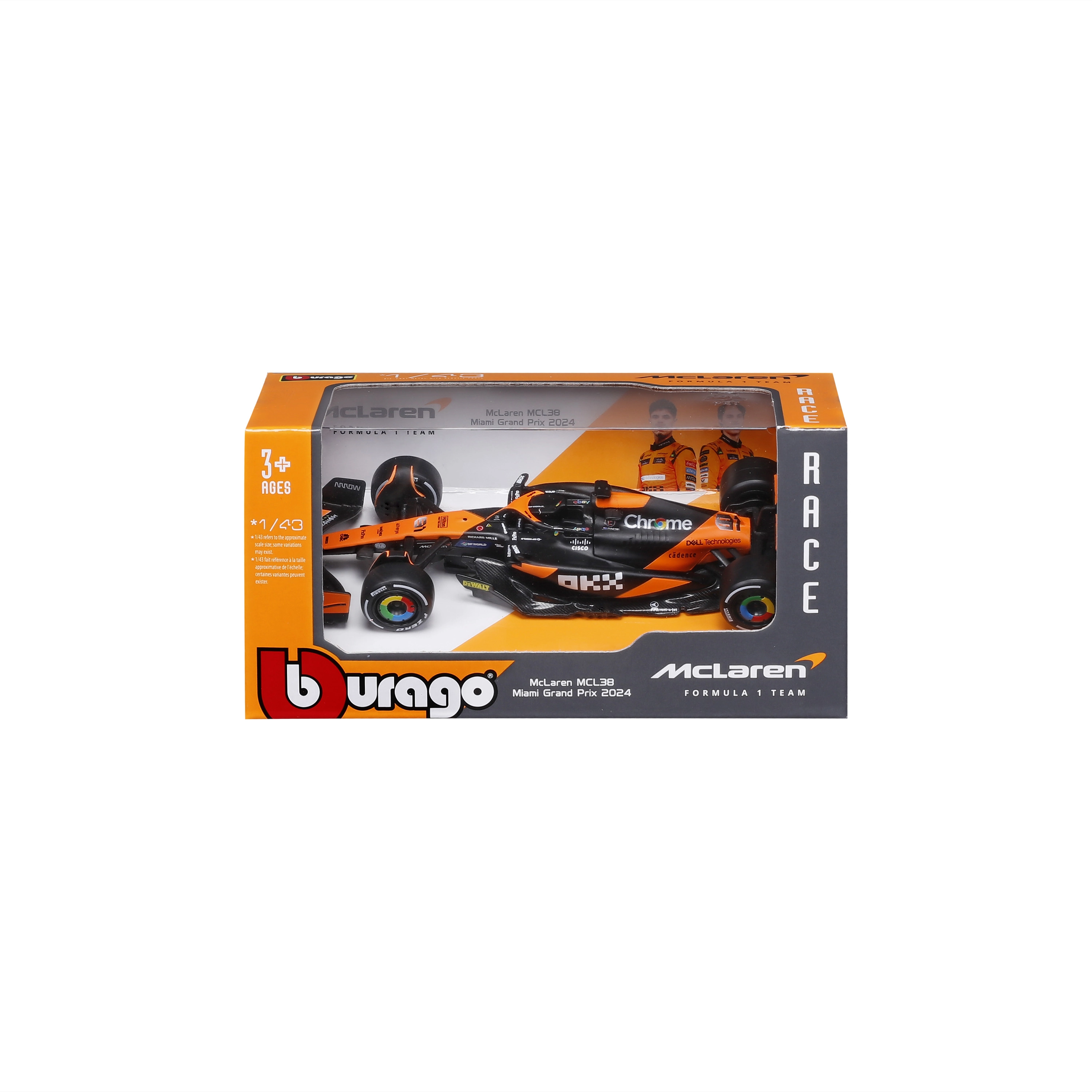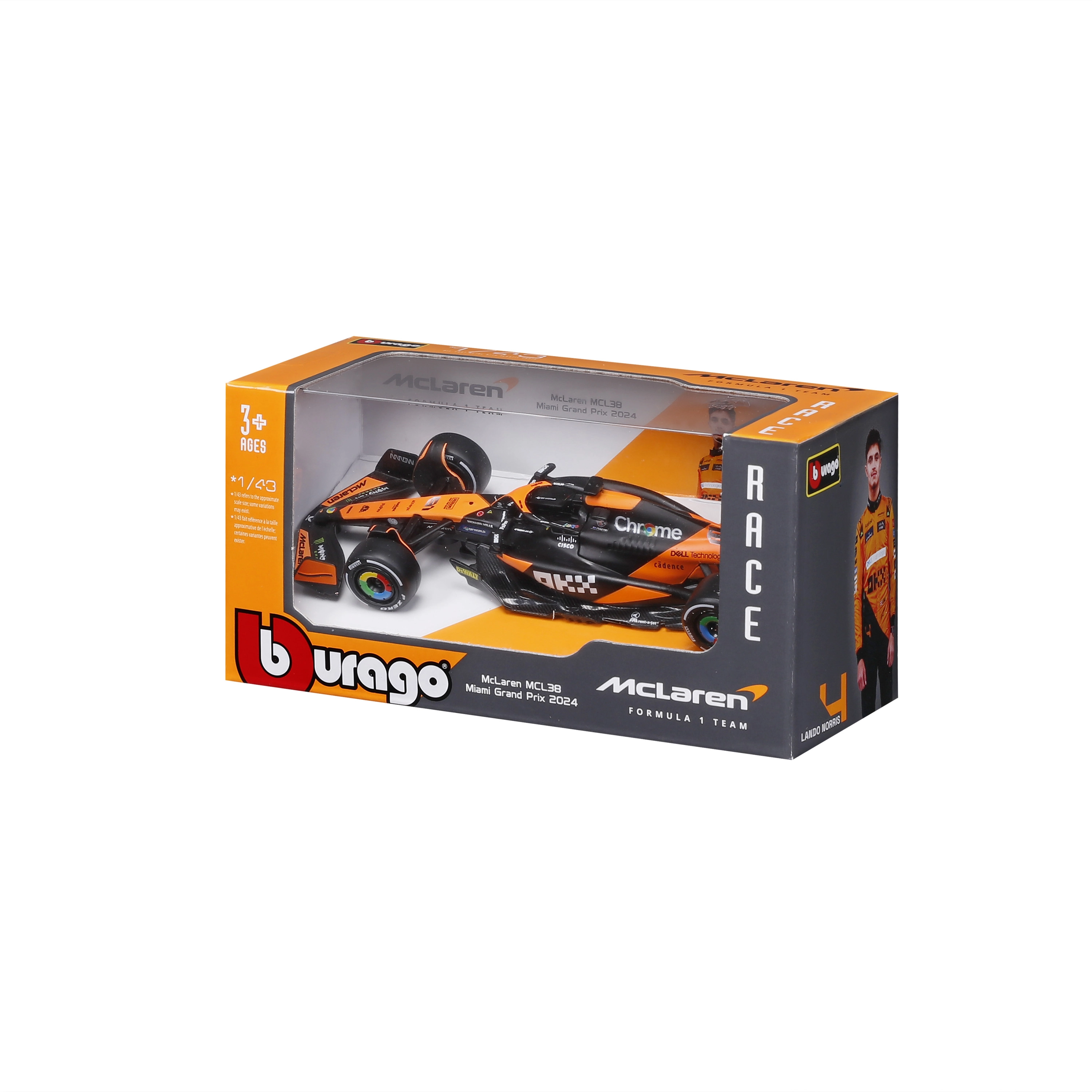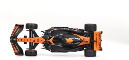 Věrné barevné schéma oranžovo‑černé závodní livery se sponzorskými logy podtrhuje realistický vzhled modelu a přináší zážitek jako na skutečné trati F1.