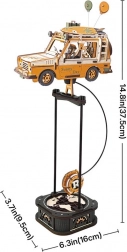 Road Tripper je promyšlený mechanický model z přírodní překližky, který po sestavení ožije díky zatíženému kyvadlu a převodům v základně. Vůz inspirovaný retro off-roady zaujme detaily – řidič s kávou, věrný pes na cestách, surf a kufr na střeše i balónky, které dotvářejí atmosféru dobrodružství.