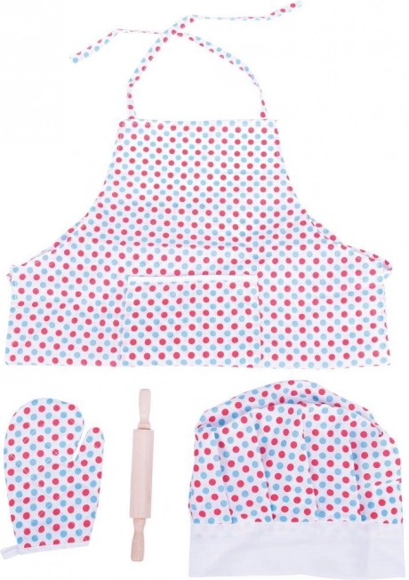 Dopřejte malým kuchařům vše, co potřebují k prvnímu pečení i zábavné hře na vaření. Lehká textilní zástěra s puntíky chrání oblečení, kuchařská čepice se díky suchému zipu snadno přizpůsobí a dřevěný váleček s kovovými vykrajovátky podnítí kreativitu a radost z tvoření.
