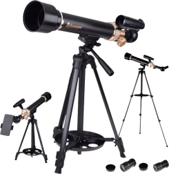 Objevte noční oblohu s lehkým a stabilním hliníkovým teleskopem 50/500 na stativu o výšce až 1,35 m. Ideální pro děti i dospělé na pozorování měsíce, jasných planet, přírody i krajiny. Výměnné okuláry poskytují přiblížení 30× a 60×, nechybí hledáček, zenitové zrcátko, držák na telefon a bezpečný sluneční filtr pro pozorování Slunce po správné instalaci.
