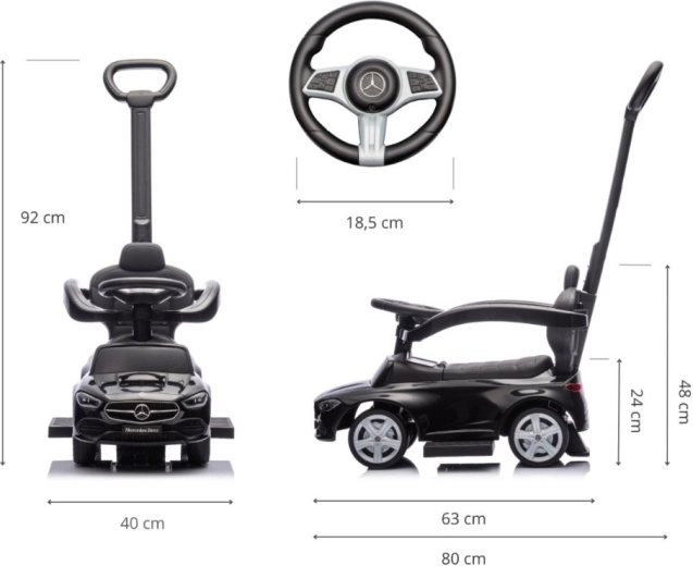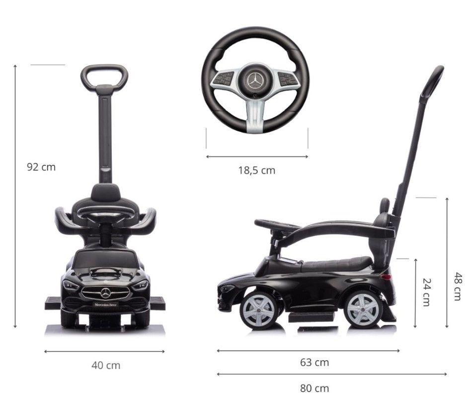 Miniaturní MERCEDES C‑Class zaujme precizními detaily – přední maskou, světly a emblémy, díky nimž si děti připadají jako v opravdovém autě. Odrážedlo kombinuje komfort, stabilitu a funkčnost: měkké sedadlo s opěrkou, ochranné zábrany a protiskluzové stupačky zajistí klidnou jízdu, zatímco rodiče mohou směr a tempo bezpečně korigovat pomocí vysoké rukojeti.