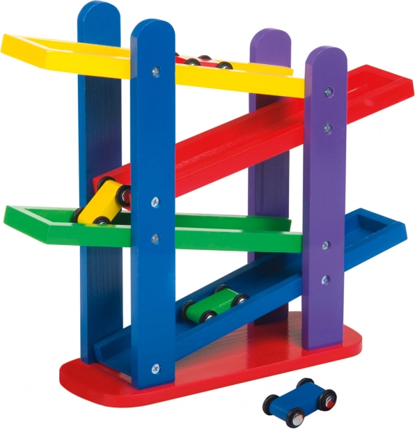 Dřevěná autodráha s třemi barevnými autíčky zabezpečuje nekonečnou zábavu díky snadnému překlopení na kaskádových barevných silničkách.