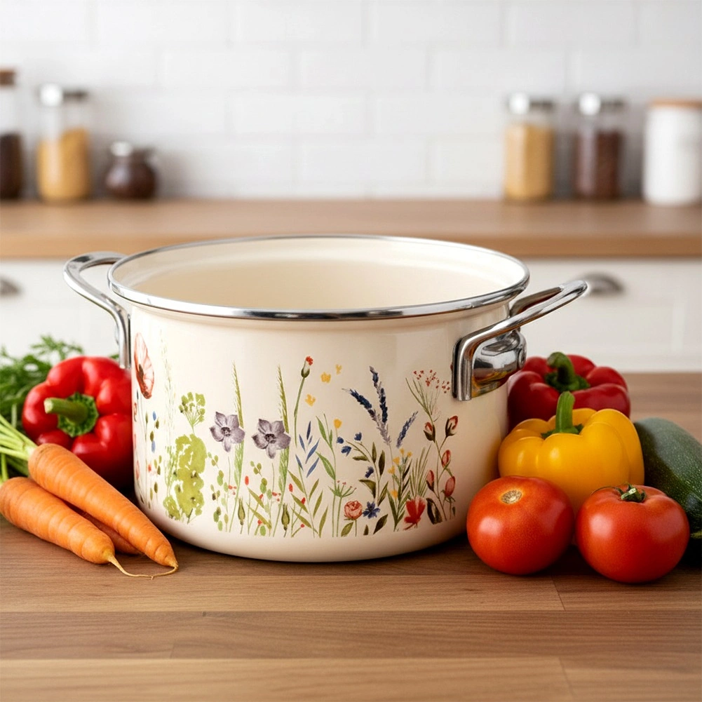 Hrnec je vhodný pro plynové, elektrické, sklokeramické, halogenové i indukční varné desky a můžete jej použít také v pečicí troubě. Díky stylovému provedení se hodí i k servírování přímo na stůl. Smaltované nádobí může nést drobné výrobní znaky (např. jemné nerovnosti tisku), které neovlivňují kvalitu ani bezpečnost a podtrhují jeho tradiční zpracování.