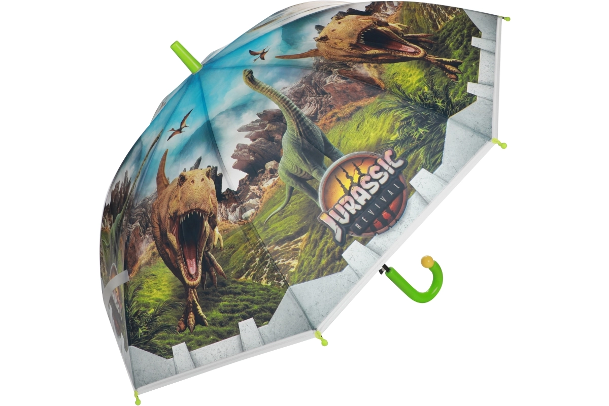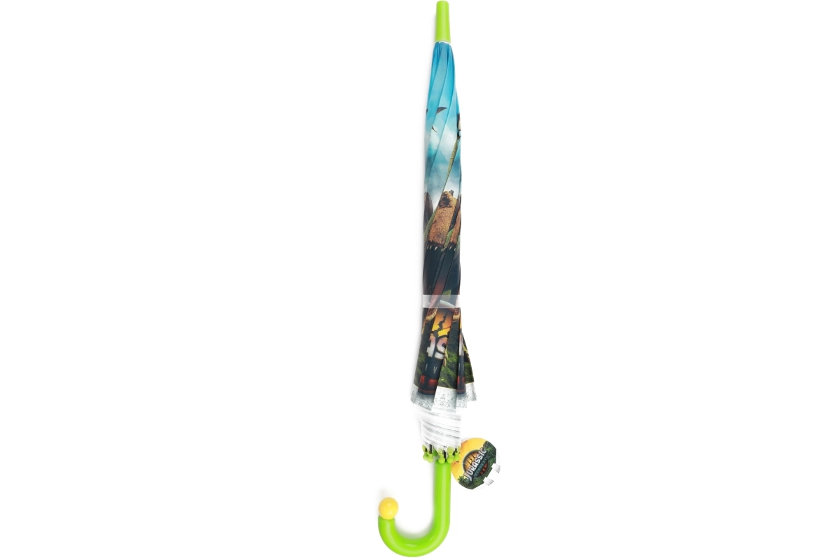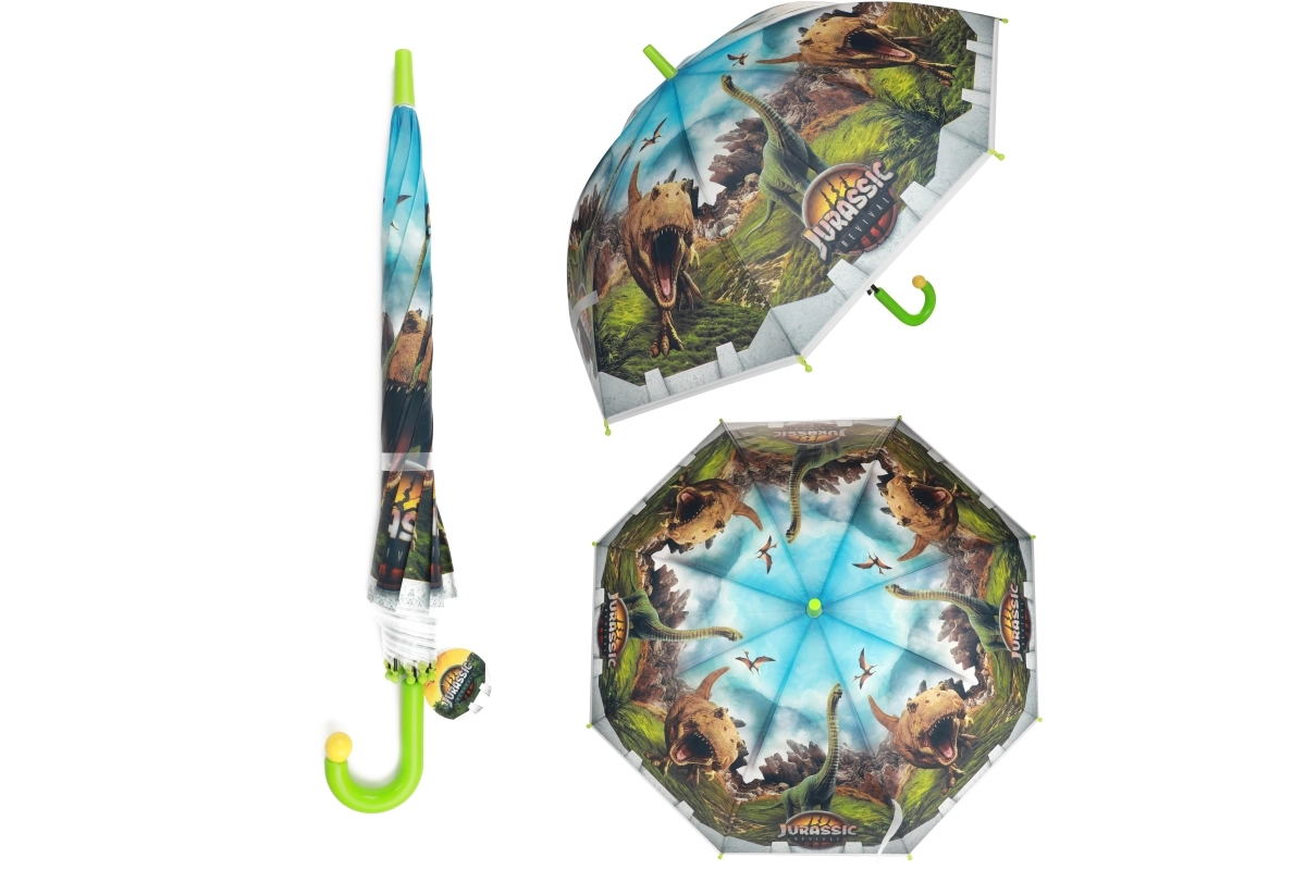 Objevte zábavný a praktický doplněk do deště: dětský deštník s motivem dinosaurů a logem Jurassic World. Pestrobarevný potisk, odolná vícedílná látková kopule a kovová žebra zajistí, že dítě zůstane v suchu a zároveň si užije originální design.