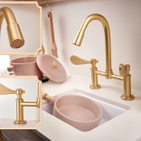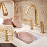 Hluboký dřez s kovově zlatým kohoutkem a dvojitými rukojeťmi podporuje hry na mytí a přípravu. Praktické police a skříňky udrží vše po ruce.