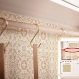 Trouba s ratanovým panelem, horní skříňka/mikrovlnka a závěsná lišta s háčky pomáhají dětem učit se pořádku a organizaci při hraní.