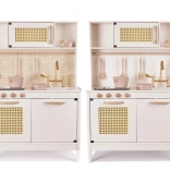 Tato dřevěná kuchyňka inspirovaná retro a boho stylem zaujme elegantní kombinací bílé, krémové a zlatých detailů. Většina prvků je ze dřeva/MDF, povrch je hladce zabroušený a natřený netoxickými barvami pro bezpečnou hru. Otočné knoflíky, otevírací dvířka a háčky na náčiní lákají k objevování a učí děti pořádku i organizaci.