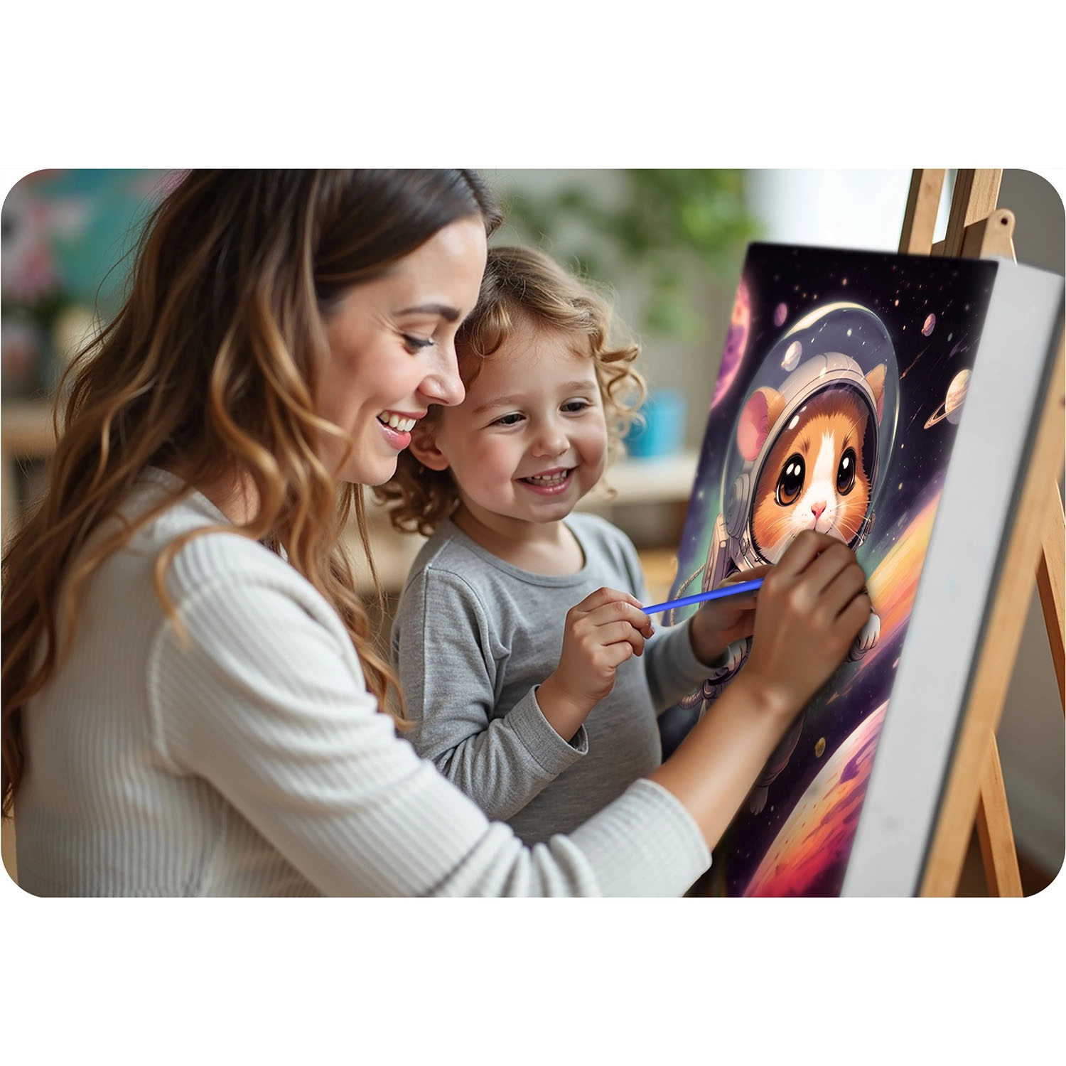 Objevte radost z tvorby s kreativní sadou malování podle čísel na plátně 40 × 50 cm. Vzor Astronaut okouzlí děti i dospělé, plátno na rámu je předem připravené k malování, v balení najdete až 30 krycích barev, 3 štětce různé tloušťky a háčky na zavěšení. Ideální pro začátečníky i pokročilé – stačí postupovat podle čísel a vytvoříte živý, barevný obraz s vesmírným motivem.