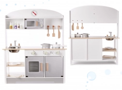 Stylová dřevěná dětská kuchyňka z MDF v neutrálních barvách přináší hodiny kreativní hry. Má kovový vyjímatelný dřez, plotýnky s otočnými knoflíky, troubu s okénkem a displejem, mikrovlnku i odkapávač na nádobí. Součástí je bohaté příslušenství ze dřeva (hrnec, pánev, talířky, nožík, lžíce, obracečka, kořenky) a praktické háčky a police pro uložení. Bezpečné, hladce broušené a natřené netoxickými barvami.