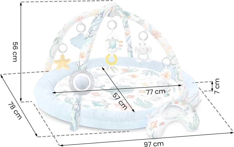 - Hrací deka s vyvýšeným okrajem, 2 odnímatelné oblouky, 7 multifunkčních hraček, polštářek