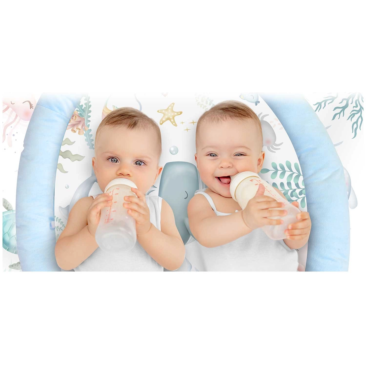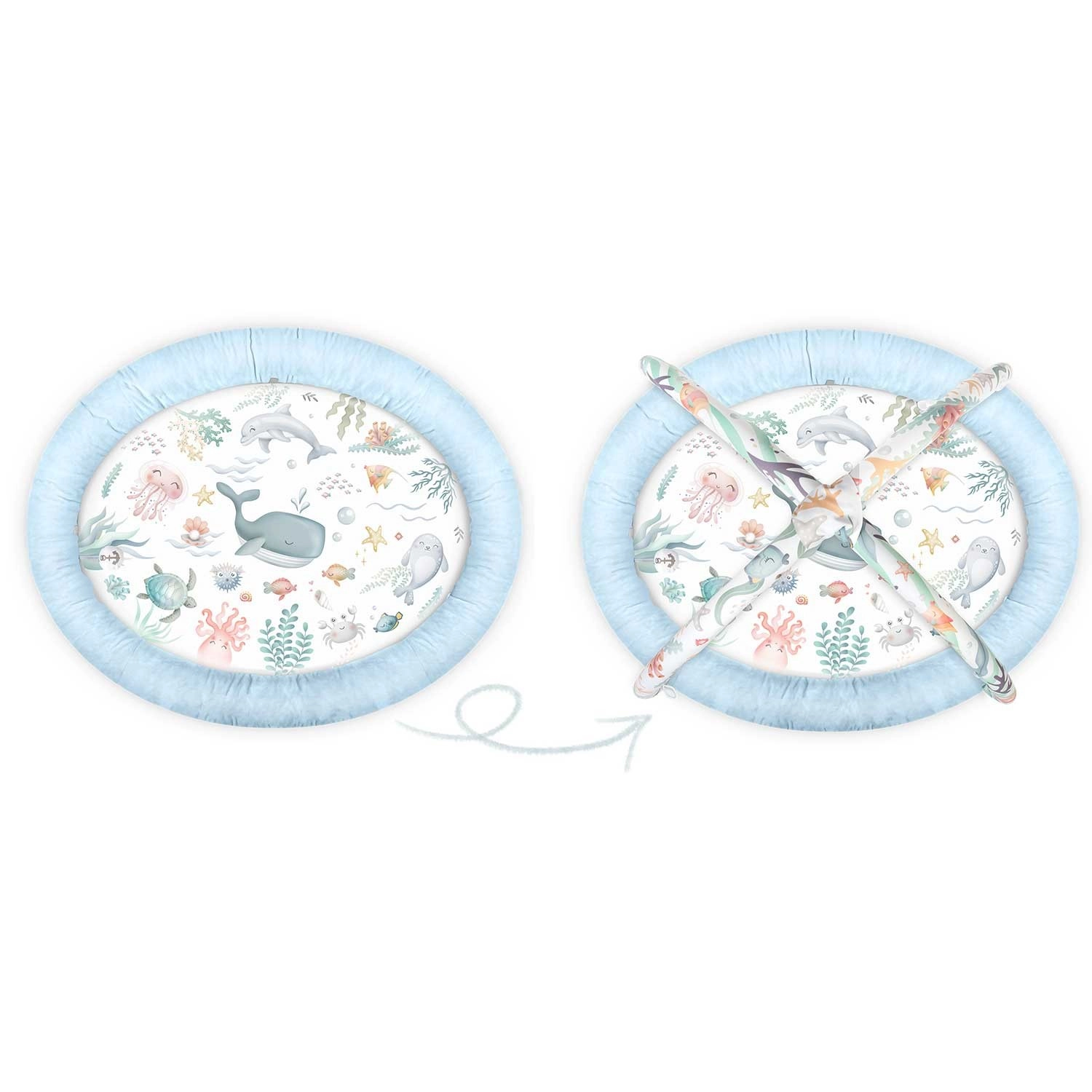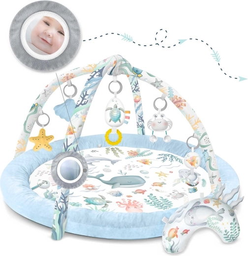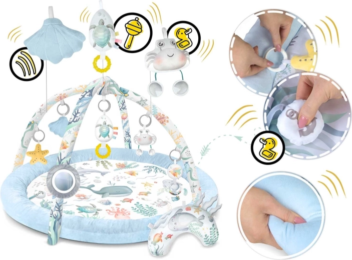 Hrací podložka Nukido Ocean vytváří útulné a bezpečné prostředí pro novorozence i větší miminka. Dva křížené oblouky nesou odnímatelné hračky, které rozvíjejí zrak, hmat i sluch – od zrcátka pro sebepoznání přes chrastítka až po šustící prvky a pískacího kraba. Součástí je i měkký polštářek pro pohodlné hraní na bříšku.