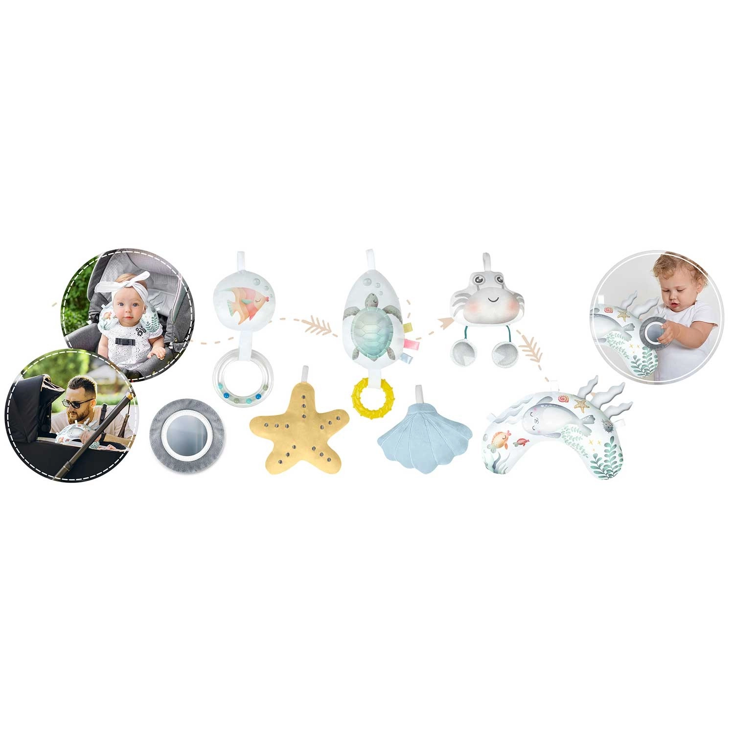 Zrcátko, chrastítka, měkké plyšové postavičky a pískací krab podporují zrak, sluch i hmat. Hračky lze libovolně přesouvat na obloucích i na okrajích.