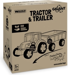 Náš velký traktor z řady Gigant je vybaven přívěsem s otvíratelnou zadní klapkou. Tyto vozidla jsou ideální hračkou pro děti, ať už jde o stavbu, nakládání nebo přesun materiálů. Pohyblivá lžíce traktoru slouží jako buldozer nebo nakladač, což přidává na zábavnosti hry. Předností tohoto traktoru je kvalitní zpracování, odolnost a nosnost konstrukce - traktor unese až 100 kg a přívěs 60 kg.