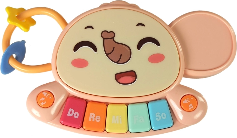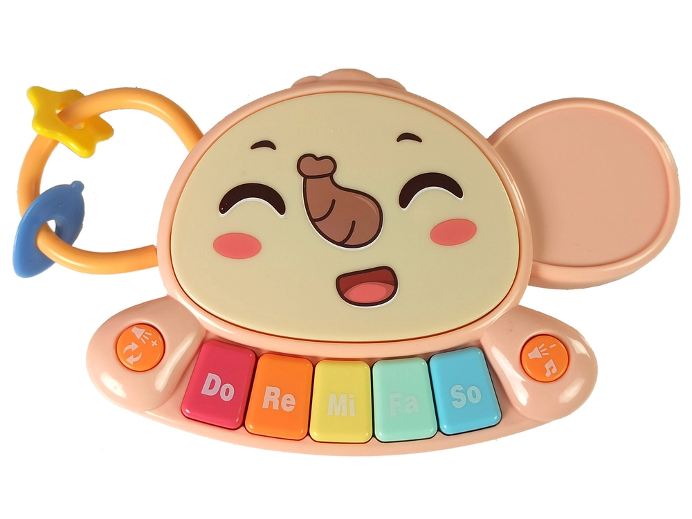 barevné piano (Do–Re–Mi–Fa–So), 3 ozubená kolečka, geometrické tvary na šňůrkách, košík a míčky, otočné kostky