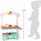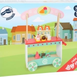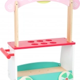Tento detailně zpracovaný dřevěný zmrzlinový vozík promění každý pokoj v hravý cukrářský koutek. Díky čtyřem kolečkům a pohodlnému madlu mohou malí prodavači vyrazit za zákazníky kamkoli. Horní deska má připravená místa pro všechny dobroty, spodní police pak poskytuje další prostor pro uskladnění hraček či doplňků.