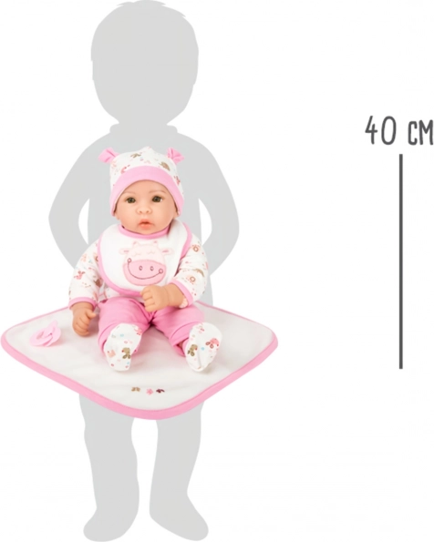 Součástí balení je oblečení pro panenku, dudlík a dečka sladěná do jemných barev. Oblečky se jednoduše oblékají i svlékají, takže děti trénují jemnou motoriku při každodenní péči o svou panenku.