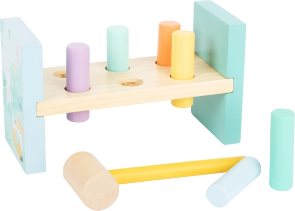 Objevte kouzlo tradiční hračky v moderním kabátě. Naše zatloukací hračka v jemných pastelových barvách je ideální pro děti, které si chtějí zkusit svou sílu a zároveň zlepšit svou motoriku. Ilustrace zvířátek dodávají této hračce unikátní vzhled. Po zábavném zatloukání všech kolíků můžete hračku jednoduše otočit a začít znovu.