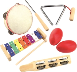 Tento 5dílný hudební set podněcuje u dětí lásku k hudbě, pomáhá jim vnímat rytmus a rozvíjí jemnou motoriku. Nástroje jsou vyrobené z odolného dřeva a kovu, mají příjemný zvuk a díky pestrým barvám lákají k objevování.