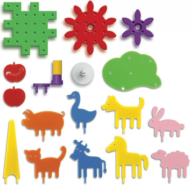 Quercetti Georello Farma je ideální hračkou pro každé dítě, které miluje tvoření a stavění. Tato převodová stavebnice obsahuje perforované desky, osky, převodová kola a figurky zvířátek, které lze jednoduše sestavit do úžasné farmářské scény. Pomocí kličky můžete uvést mechanismus do pohybu, a vidět, jak se vše točí jako na kolotoči.