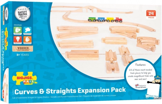 Dřevěný set kolejí od Bigjigs Rail s 24 díly nabízí možnost rozšíření a personalizace vaší vláčkodráhy. Kvalitní přírodní materiál a dokonalá kompatibilita s ostatními značkami činí tento set ideální volbou pro rozvoj dětské představivosti.