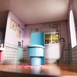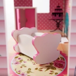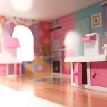 Součástí je 9 kusů nábytku: šatní skříň, kolébka, lampa, 2 židle, stůl, kuchyň s digestoří, skříňka se dřezem a toaleta – připraveno k okamžitému hraní.