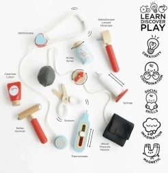 Stylová doktorská sada pro malé lékaře a lékařky v textilní brašně s dřevěnými uchy přináší vše potřebné pro hru na ordinaci. Obsahuje celkem 10 dílů včetně stetoskopu, teploměru a injekční stříkačky. Hračka je genderově neutrální, podporuje jemnou motoriku, představivost a kognitivní dovednosti. Vyrobeno z udržitelného dřeva s certifikací FSC a ručně domalováno netoxickými barvami na vodní bázi.