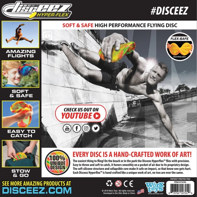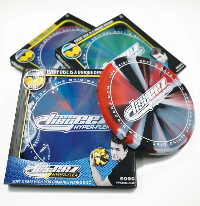 Létající talíř DISCEEZ Hyper-Flex o průměru 20,5 cm je navržen pro maximální zábavu a bezpečí. Je vyroben z měkkého, ohebného materiálu, který zajišťuje stabilní let a pohodlné chytání bez bolestivých zásahů. Díky atraktivním vzorům a barvám si ho děti i dospělí okamžitě zamilují.