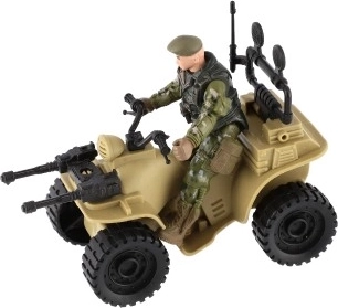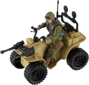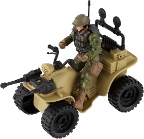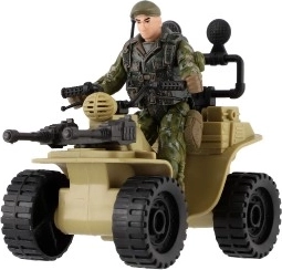 Tato čtyřkolka nabízí realistické detaily včetně kamuflážního oblečení vojáka a velkých černých pneumatik.